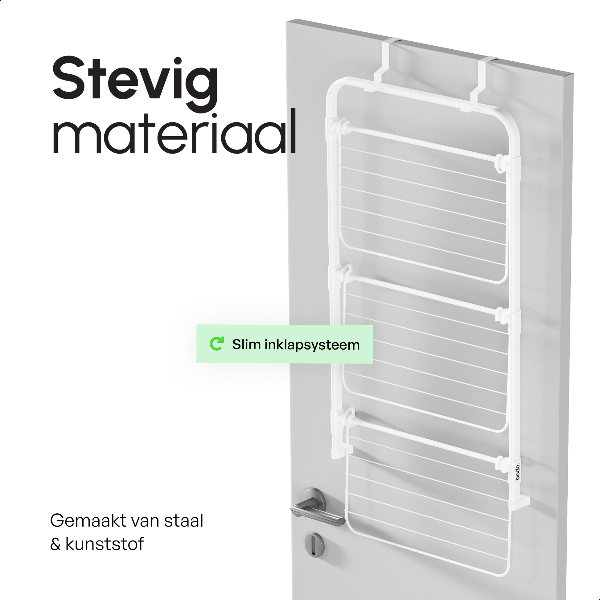 Wil je kleding, handdoeken of delicaat wasgoed laten drogen zonder gedoe? Het Bodo® Ascend Door droogrek is dé slimme oplossing voor kleinere ruimtes. Je hangt het rek eenvoudig over een deur, radiator, douchewand of kastdeur – zonder te schroeven of te monteren. Ideaal voor appartementen, badkamers, studentenkamers of als extra droogplek naast de droger.