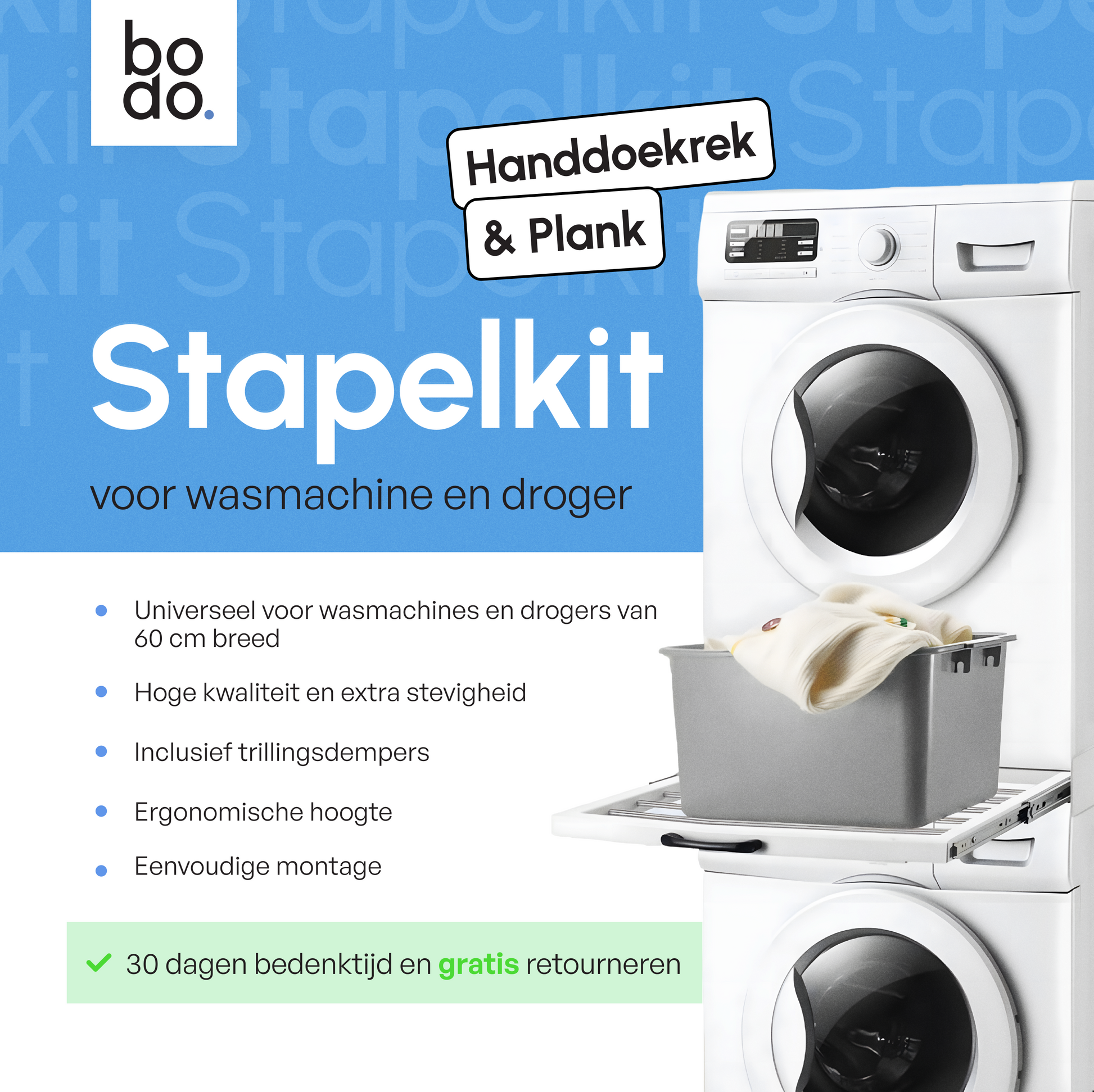 Bespaar kostbare ruimte in uw huis met de stapelset voor wasmachine en droger van Bodo. Met dit slimme ontwerp kunt u uw wasmachine en droger boven elkaar plaatsen en zo ruimte besparen. Geen gedoe meer met het zoeken naar twee aparte plekken voor uw apparaten, deze kit zorgt dat beide machines perfect op elkaar passen. Bovendien staat de set op de ideale hoogte, waardoor u niet meer hoeft te bukken bij het in- en uitladen van uw was.