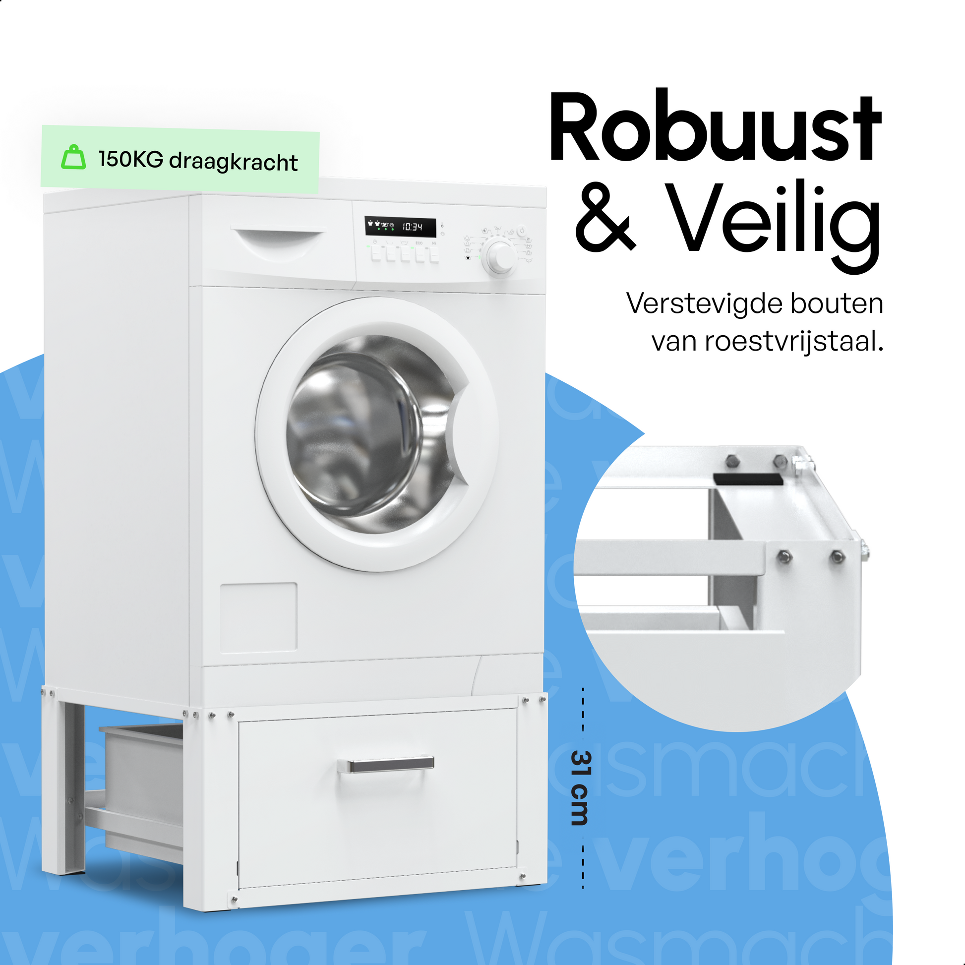Ja, deze verhoger is gemaakt van een robuust stalen frame met een draagvermogen van 150 kg. Dit zorgt voor een stabiele en veilige plaatsing van je wasmachine. Daarnaast biedt het frame bescherming tegen roest, stof en lekkage, wat de duurzaamheid van je wasmachine verhoogt.