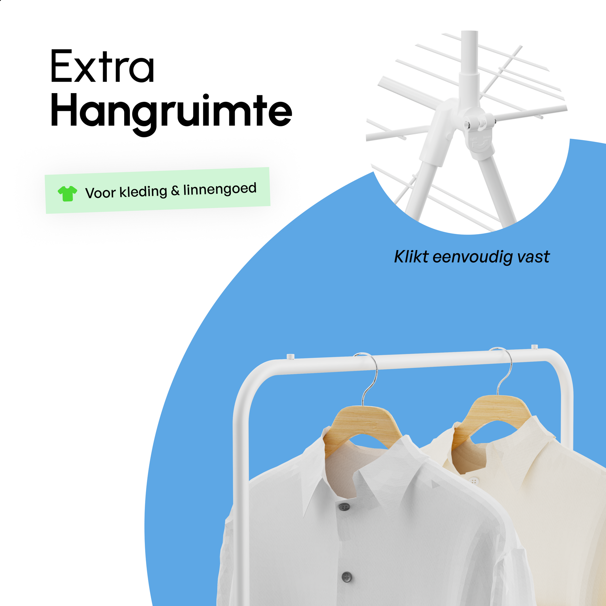 Het slimme uitklapsysteem aan de bovenzijde biedt extra ruimte voor langere kledingstukken en hangend drogen. Tegelijk blijft het rek stabiel, zelfs bij volledige belading. Na gebruik klap je het droogrek eenvoudig in tot een compact formaat, zodat het weinig ruimte inneemt in huis.